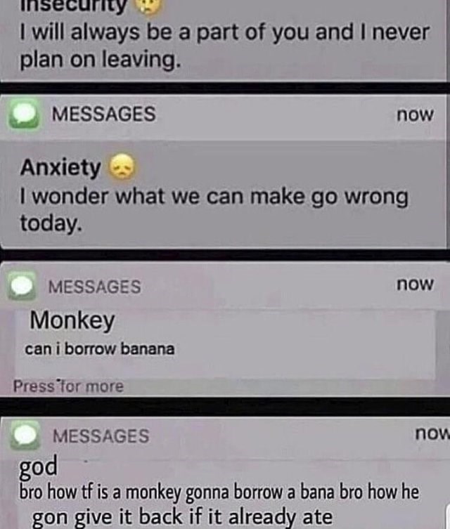 Make a Meme Make a GIF Make a Chart Make a Demotivational Flip Through Images. Insecurity Anxiety Text Messages refers to an exploitable image of an iPhone screen of a person who has received texts from manifestations of their insecurity anxiety and a third party which is changed in the exploitables to be something humorous. This indicates that the Internet responds to different.